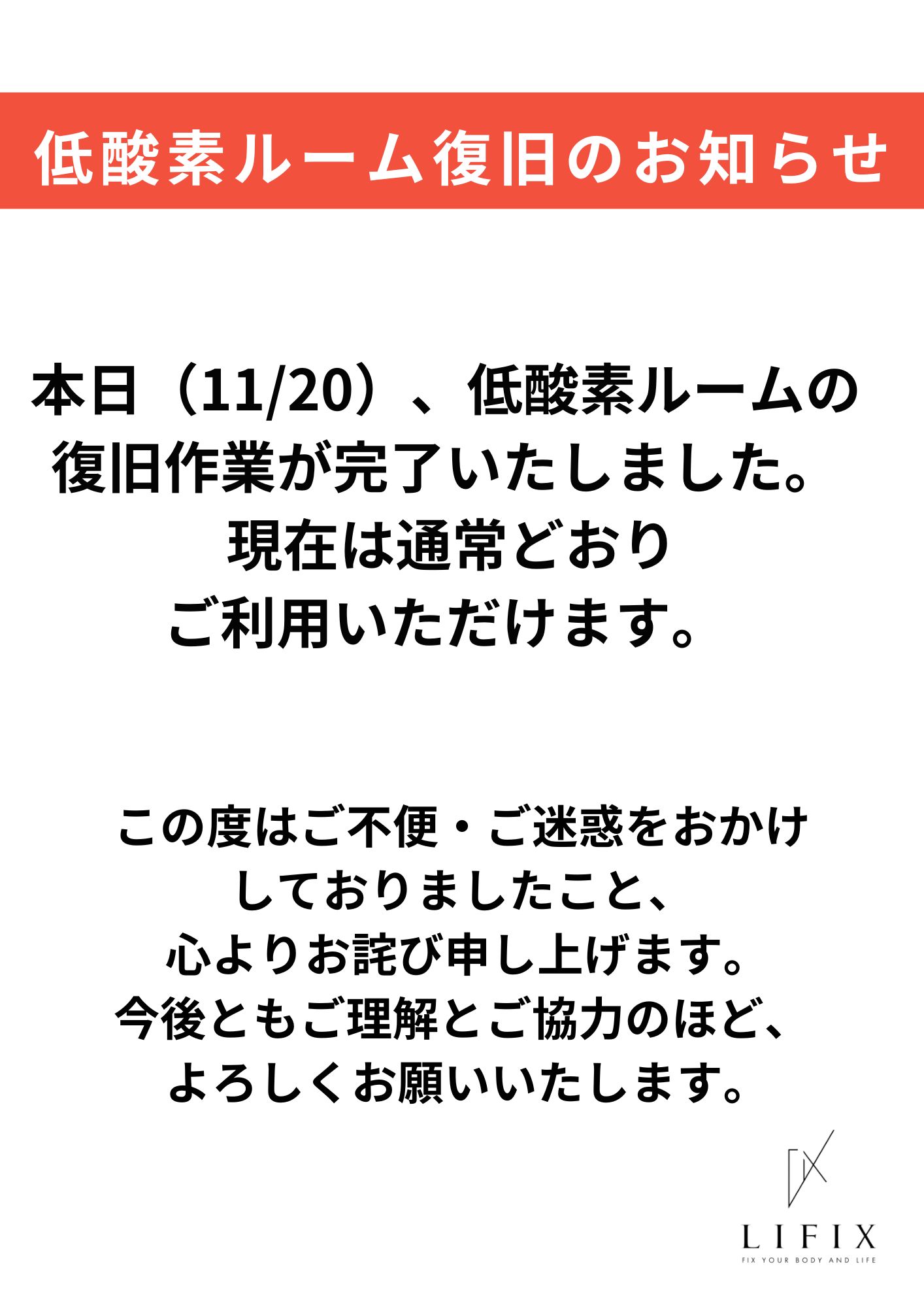 本日(11/20)、低酸素ルームの復旧作業がすべて完了いたしました。